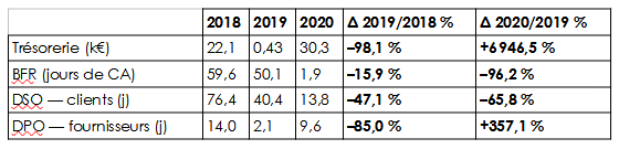 - BFR : diminution de 50 jours à 1,9 jour de CA, soit un cycle d’exploitation quasi neutre en besoin de financement.