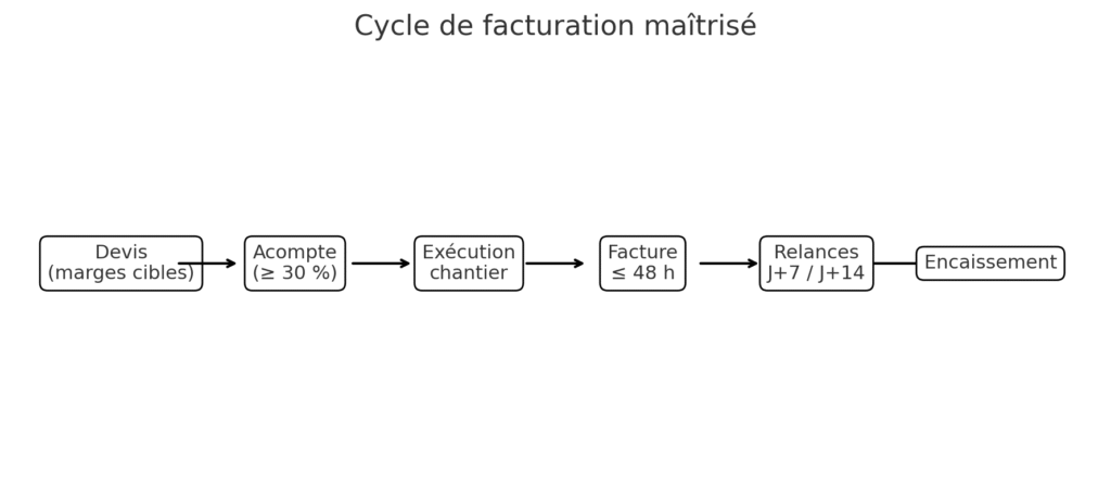 - Outillage : déploiement d’une application de gestion gratuite (devis, Facture X, échéanciers, signatures), alertes d’impayés, relances e‑mail automatisées, rapprochement encaissements.