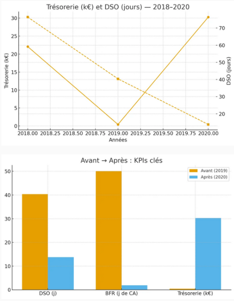 - Encaissements : DSO réduit de 76 jours à 13,8 jours ; relances désormais systématiques et tracées.